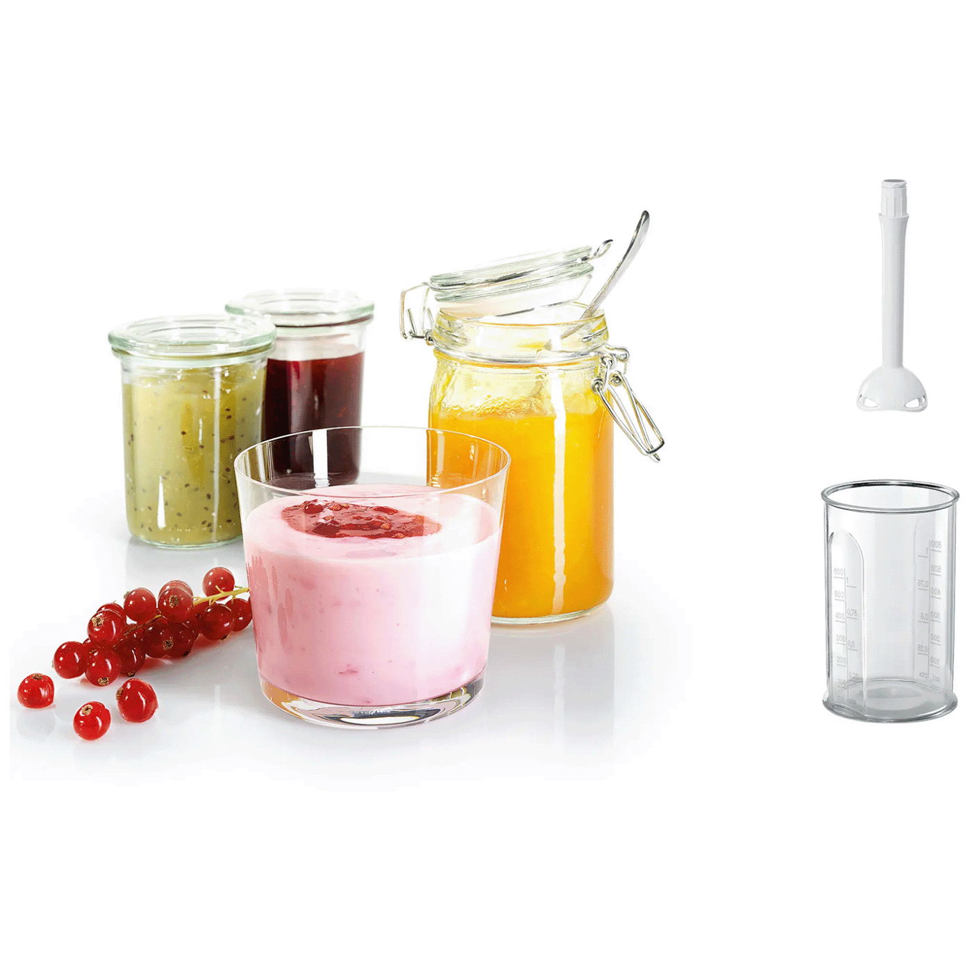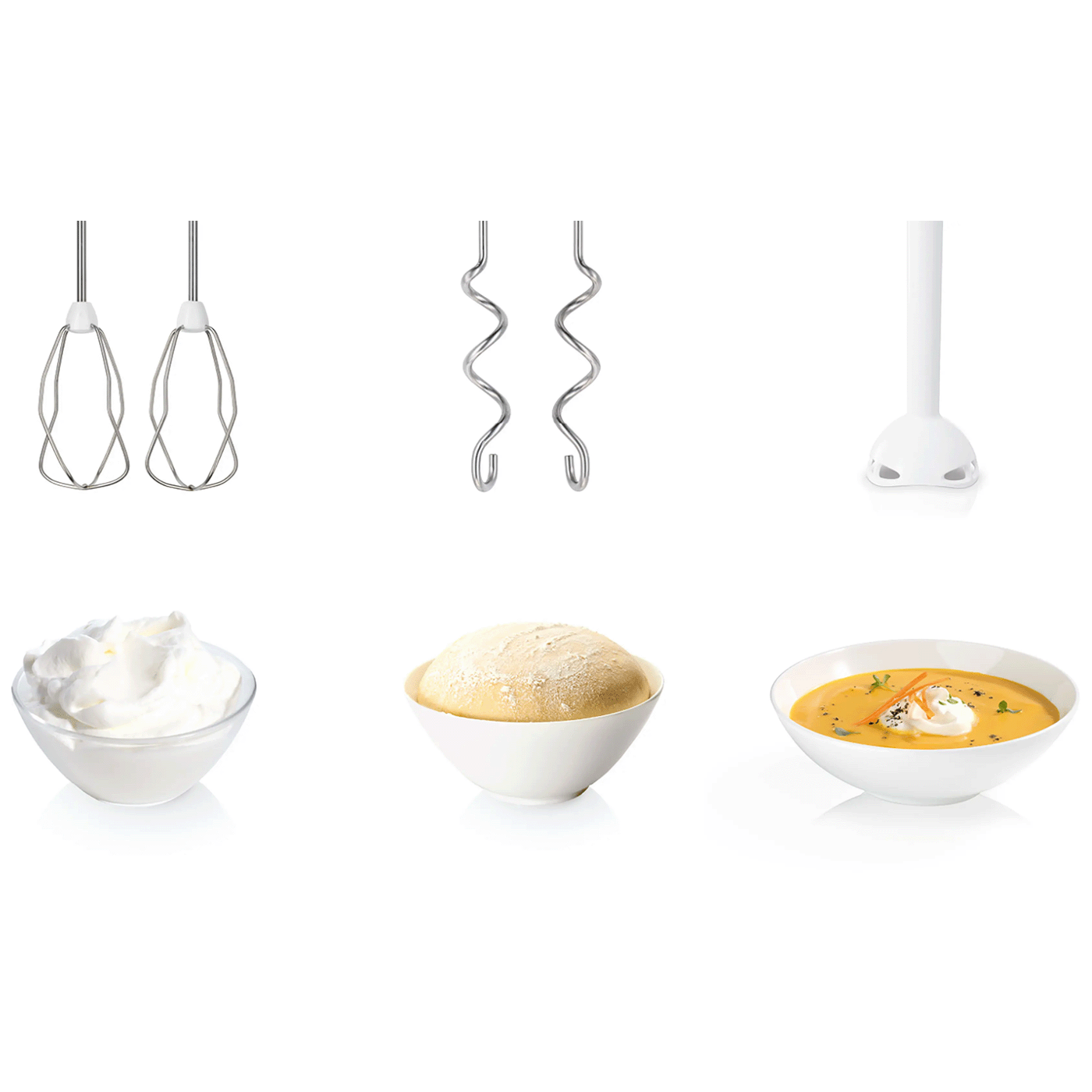 Ručna je miješalica opremljena glavom miješalice koja pruža više raznolikosti kod pečenja i kuhanja, poput pripreme voćnih nadjeva i punjenja za kolače, sladoleda ili ukusnih juha. Pričvrstite jednim jednostavnim klikom.