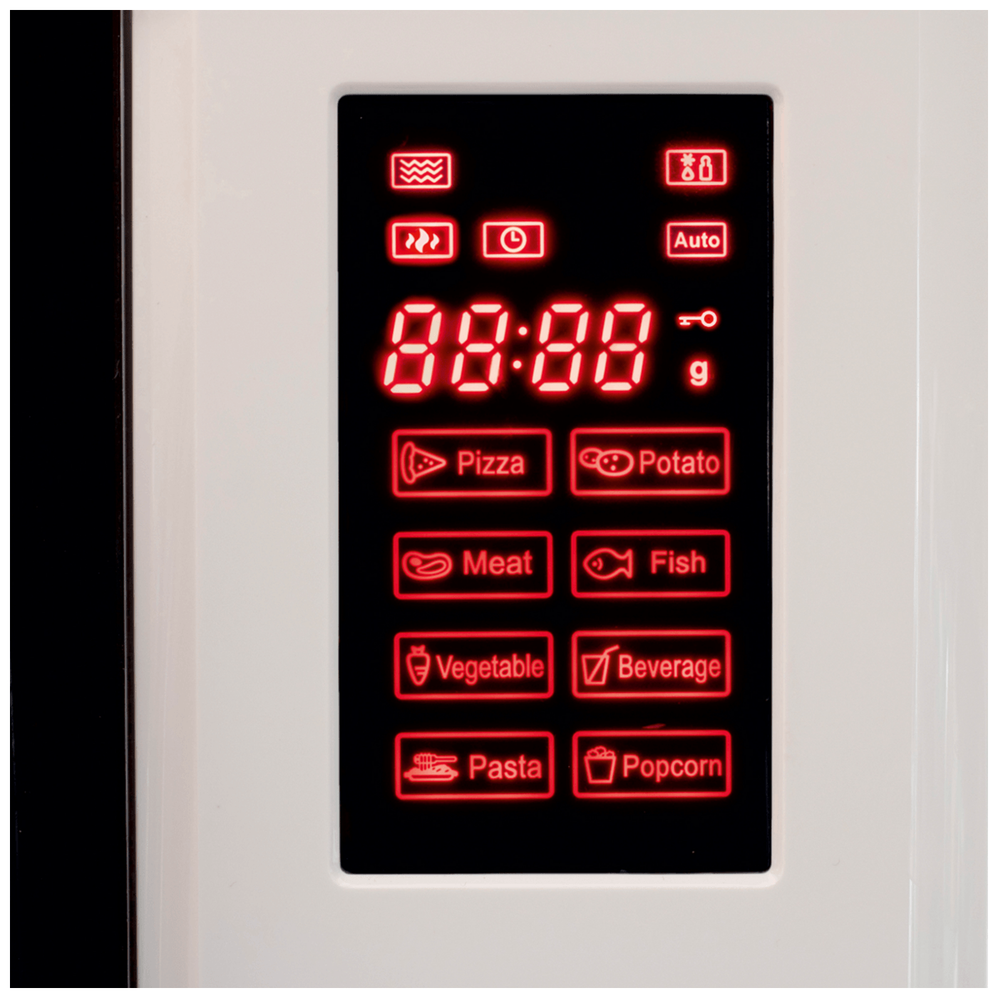 Mikrovalna pečnica, snaga 800 W, zapremina pećnice 23 litara, rotirajuči stakleni tanjur 27 cm, 5 nivoa mikrovalne snage, digitalna kontrola, LED zaslon, točno vrijeme, timer do 95 minuta max., unaprijed programirani programi, odmrzavanje po težini i vremenu, brava za djecu, otvaranje vrata na lijevu stranu, vrata staklena, dimenzije aparata 485 x 293 x 405 mm, boja bijela